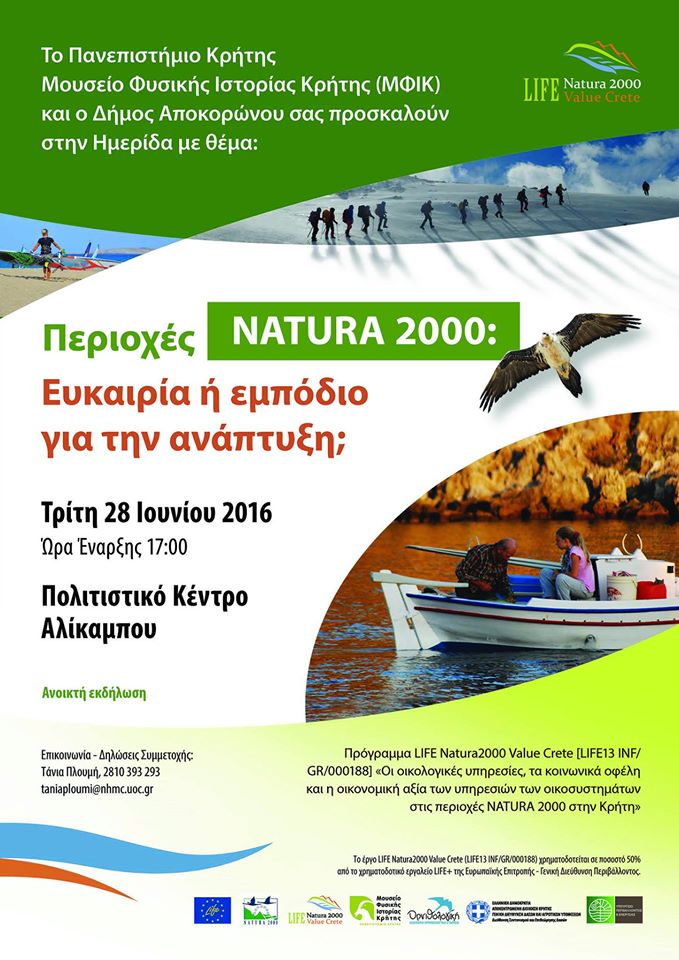 Στα πλαίσια των δράσεων επικοινωνίας του έργου LIFE Natura2000Value Crete το Πανεπιστήμιο Κρήτης-Μουσείο Φυσικής Ιστορίας Κρήτης (ΜΦΙΚ) οργανώνει ημερίδες με θέμα "Περιοχές NATURA 2000: Ευκαιρία ή εμπόδιο για την ανάπτυξη;". Οι ημερίδες θα πραγματοποιηθούν τη Δευτέρα, 27 Ιουνίου 2016, Αίθουσα Διαλέξεων στο ΕΒΕΧ (Επιμελητήριο Χανίων) (Πλ. Σοφοκλή Βενιζέλου 1, Χανιά 731 34, τηλ. 2821 052329), ώρες 17.00 - 21.00, και την Τρίτη, 28 Ιουνίου 2016, Δήμος Αποκορώνου, Πολιτιστικό Κέντρο Αλικάμπου, ώρες 17.00 - 21.00.
