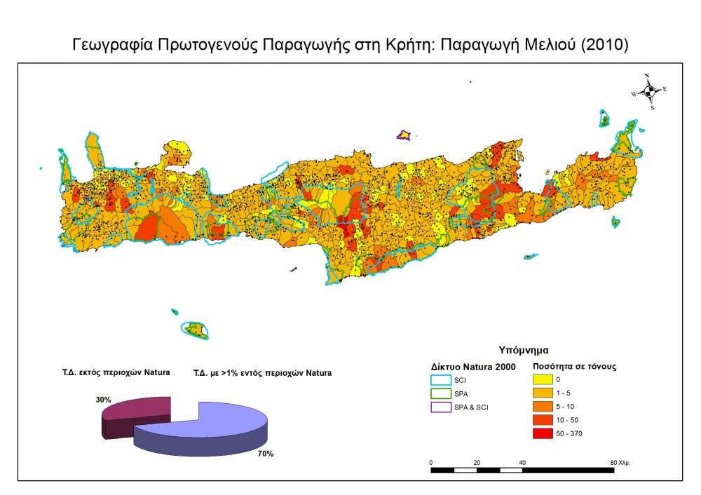 The results show an increased agricultural production inside or close to NATURA 2000 sites. The livestock production seems to be very important. Despite the fact that only 7% of the population of Crete resides in NATURA 2000 sites, the production, for example of beekeeping is almost 70%. The same percentages characterise the production of cheese and dairy products, while the production of sheep and lamb meat is 62 - 66%. Concerning the people working in the various sectors, 63% of the population inside or close to the NATURA 2000 sites is inactive, while 56% is inactive in the rest of the areas. 35,7% of the economically active population inside or close to the NATURA 2000 sites works in the primary sector, while 10,8% of the population in the rest of Crete is occupied in this sector.